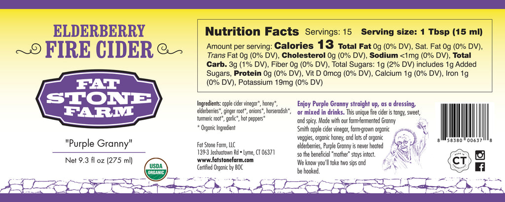 Tangy, complex, and sweet, our organic Elderberry Fire Cider (a.k.a. Purple Granny) is apple cider vinegar infused with elderberries, honey, and 6 super root vegetables grown here at the farm. With all ingredients in balance, you'll taste a complex, invigorating and exciting burst of flavor. You can sip it straight, as a "shot", or sprinkle it on your tossed salad.